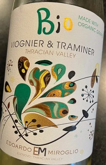 Bio Viognier + Traminer 2022, Thracian Valley, Bulgaria. From Edoardo Miroglio. A 50/50 blend of white grapes viognier and gewurztraminer. Excellent. About $16.