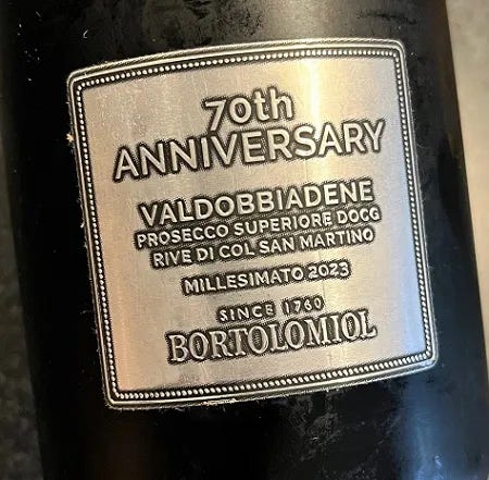 Bortolomiol “70th Anniversary” Valdobbiadene Rive di Col San Martino 2023, Prosecco Superiore, Italy. Excellent. About $20.